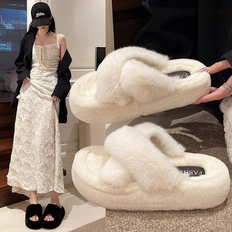 Cross-strapped fluffy slippers for women to wear outside autumn and winter new thick-soled heightened plush cotton slippers