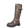 Women's Autumn Boots Pu Leather Belt Buckle Knee High Boots Black Brown Western Cowboy Casual Shoes Medium Heel Bottes Femmes