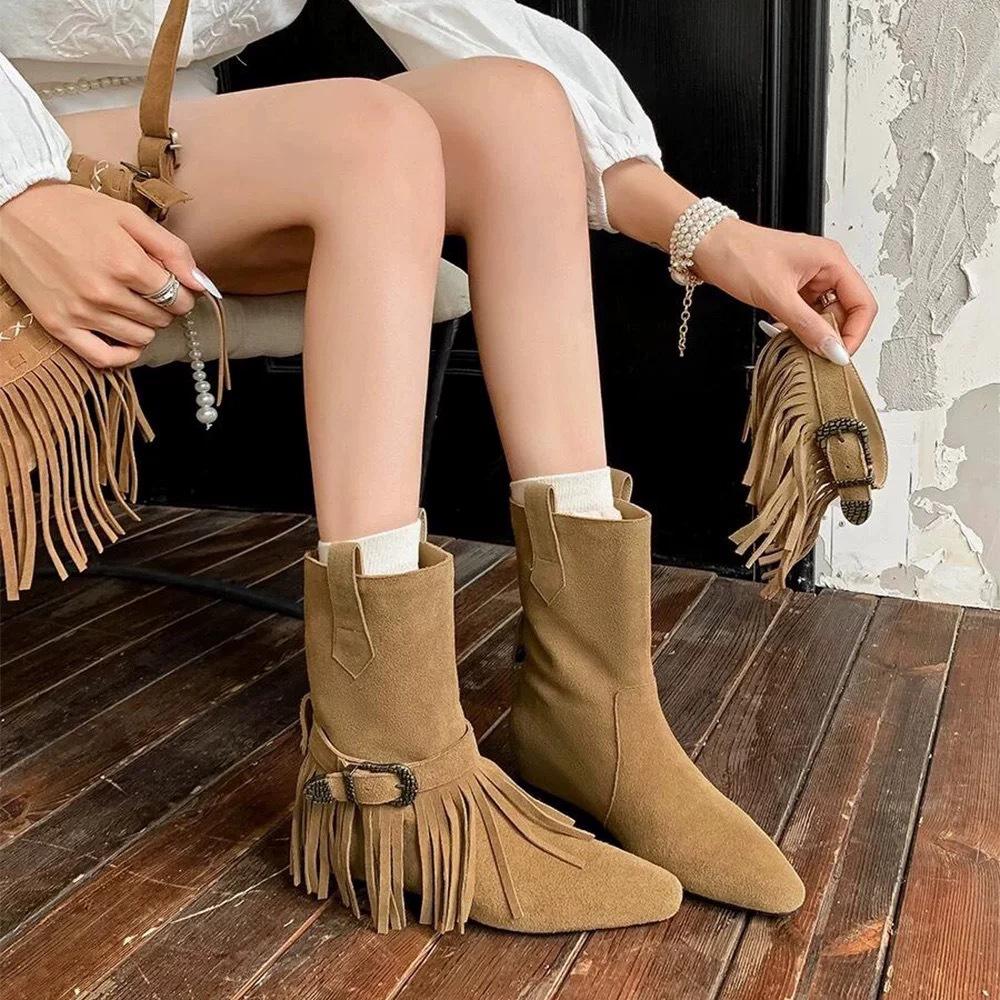 Niche two-wear design sense fringed pointed Martin boots western cow boots women's autumn and winter mid-boots flat-bottomed short boots