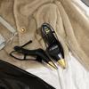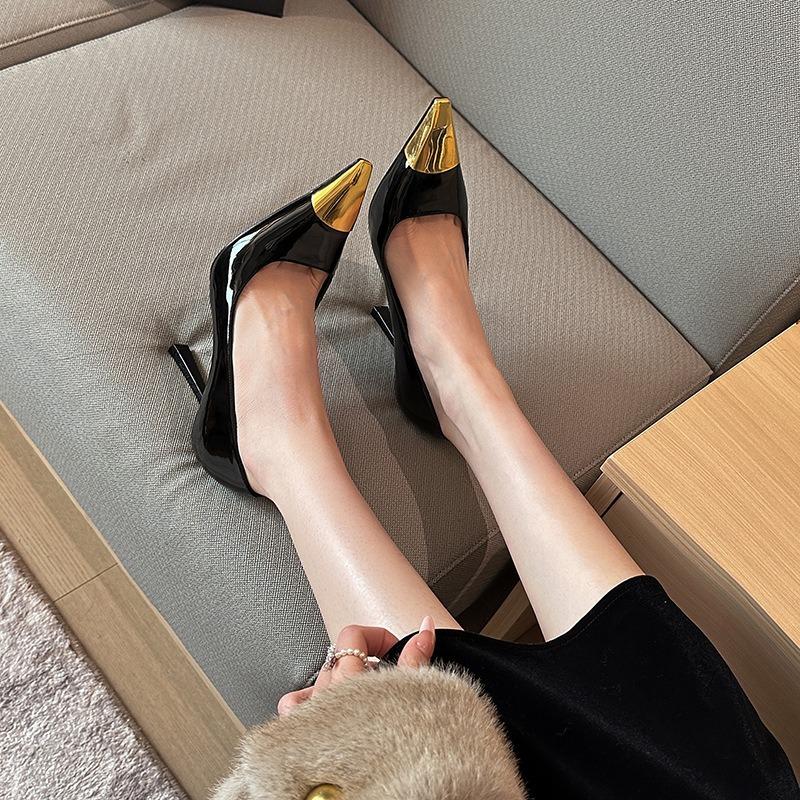 Black patent leather metal-toed high heels women's new thin heels and pointed toes are not tiring to the feet, shallow sexy shoes