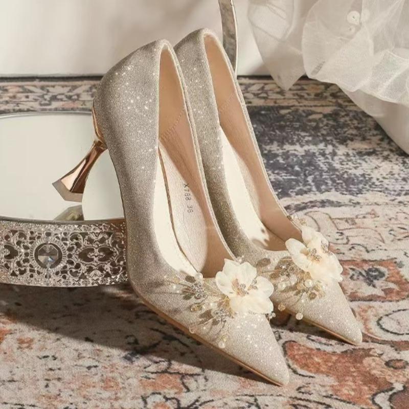 Fashion Women's Thin Heel Shoes Fall New Pointy Head Shallow Mouth Glitter Flower Anti-slip Wear-resistant High Heels