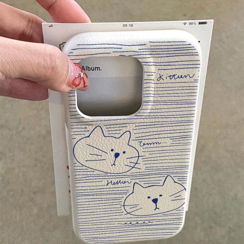 Blue Line Cat for Apple 16pro Mobile Phone Case 15proma X Soft Glue 13p Imitation Leather 12pro Cartoon