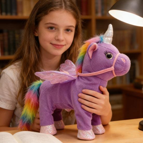 This walking horse toy is an electric plush companion that walks and sings, crafted from soft cloth and durable padded polyester. Its high-quality, skin-friendly, and odorless material ensures safety and comfort for children.