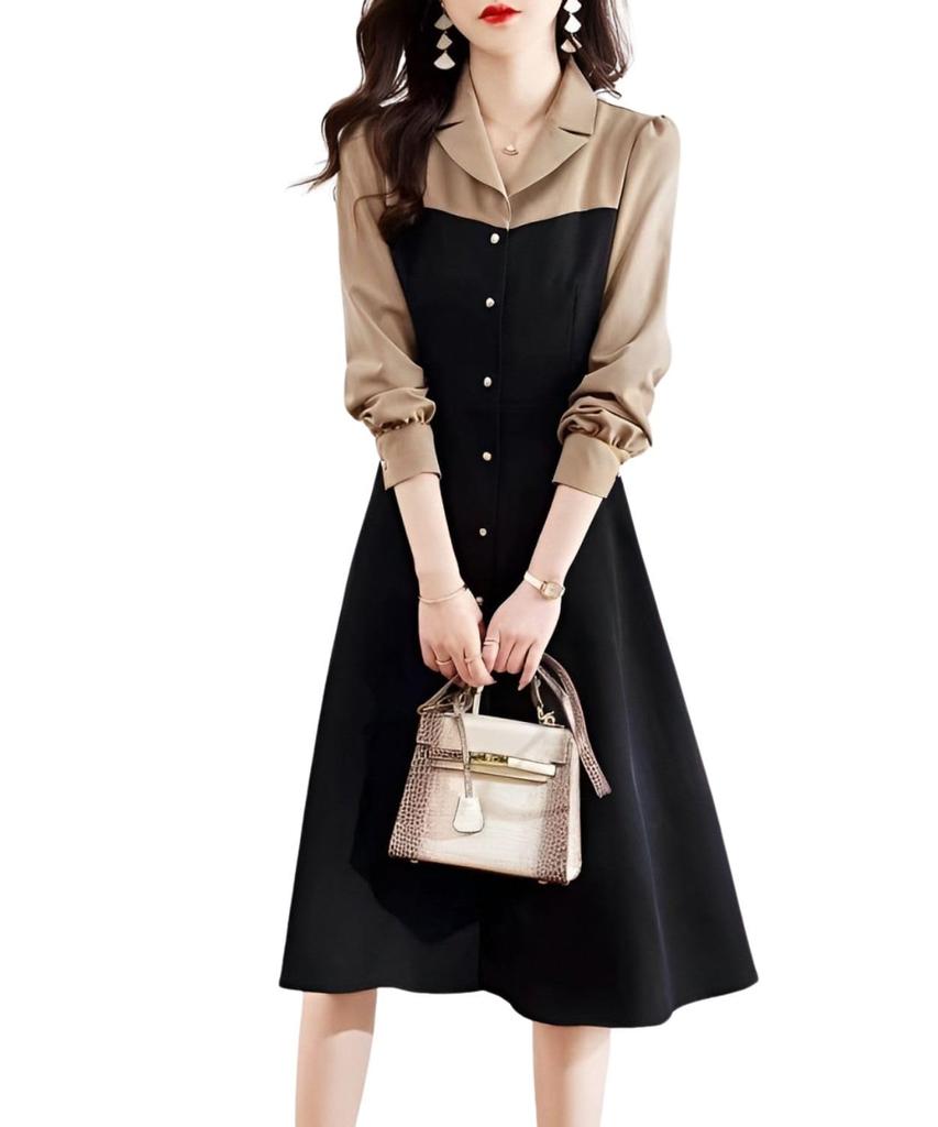 A versatile docking dress that creates a cute, feminine look with just one piece. This elegant and classic two-tone shirt dress features a subdued two-tone color scheme. The high waist flare creates a flattering effect. With its understated design and elegant length, this dress is perfect for everyday wear, whether for work or a quick outing. Includes decorative belt. No pockets.