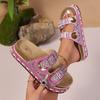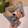 Women's Wide Width Bohemian Slides, Rhinestone Jute Platform Sandals, Ethnic Beach Slippers for Women