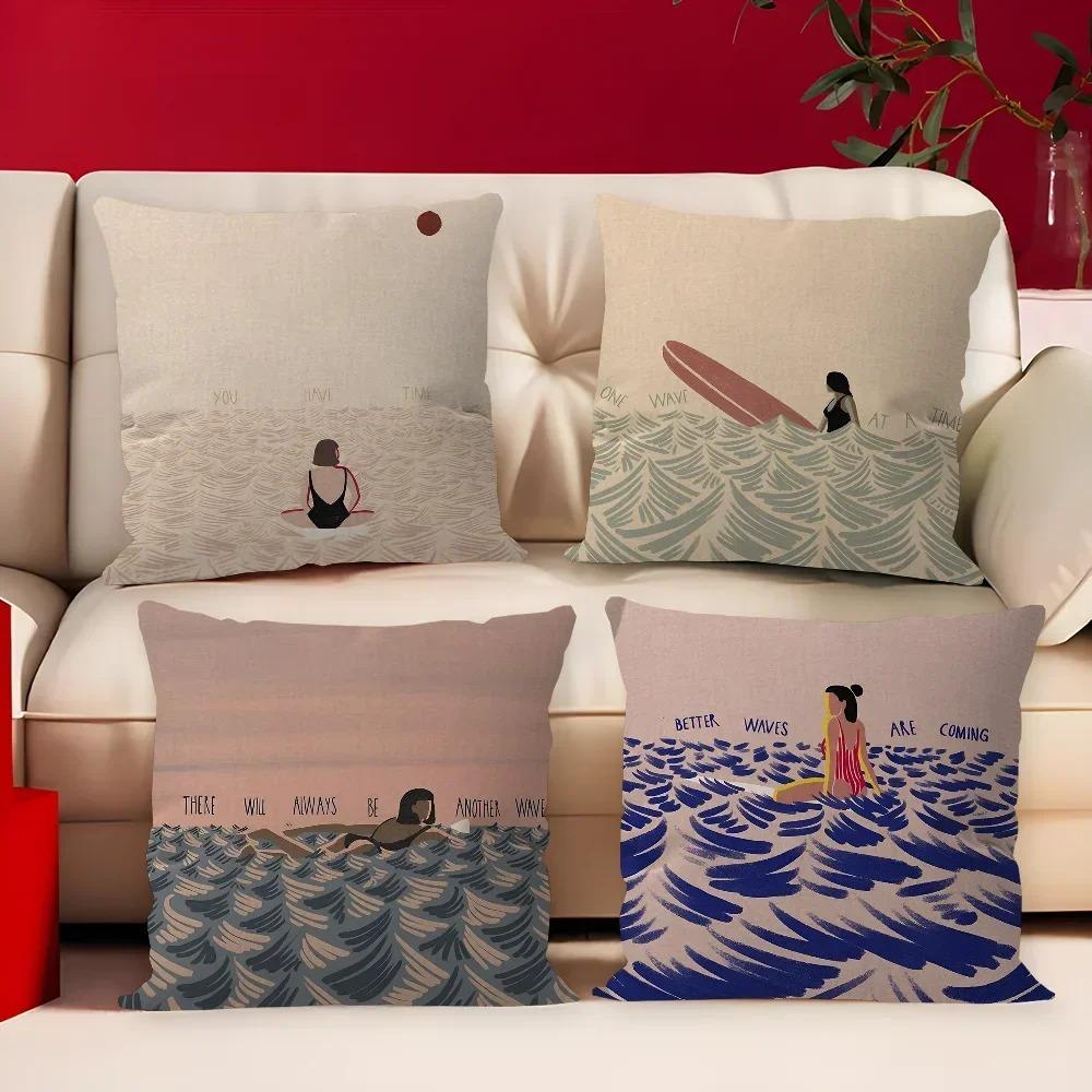 Home Decor Surfing Girl Motifs: Waves & Positive Sayings Pattern Cushion Cover Suitable for Sofa Bedroom Car Pillow Cover