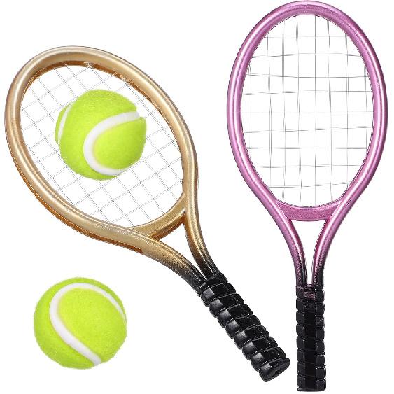 Kisangel 2 Sets Mini Tennis Racket and Ball Set 1:12 Miniature Tennis Kit Dollhouse Tennis Toy Mini Tennis Cake Topper for Sports Equipment