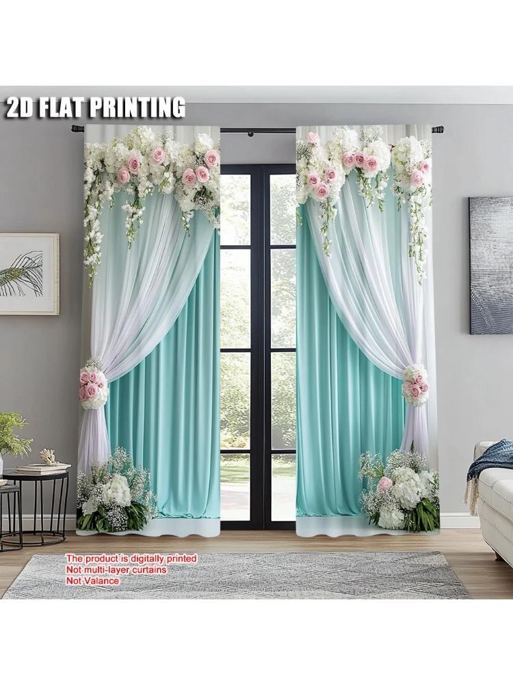 2pcs Light Filtering Curtains print Elegant Green and White Curtain Fabric (without rod) Thermal Insulation and Room