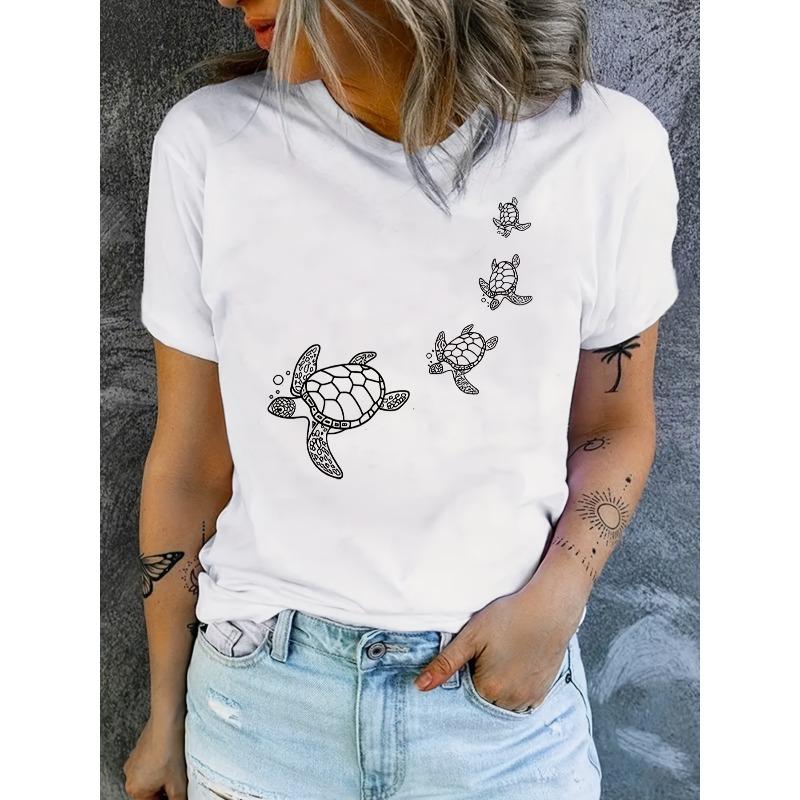European Size Women'S Chic Turtle Print T-Shirt Comfortable Fashion Casual Short Sleeve Round Neck Daily Wear Top