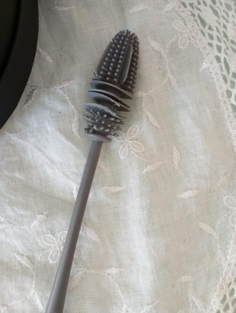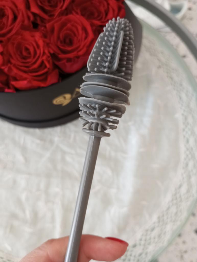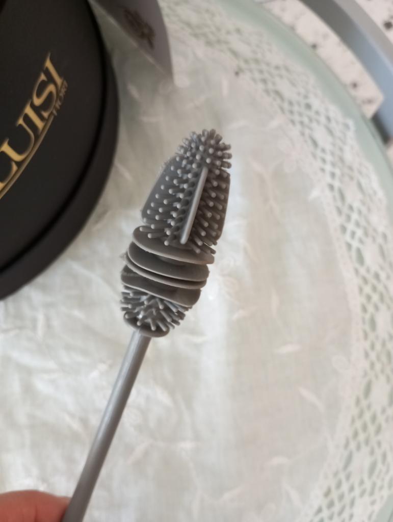 ⭐⭐⭐⭐⭐ Universalus ir higieniškas pagalbininkas valymui! Įsigijau šį silikoninį šepetėlį ir turiu pasakyti, kad jis pasiteisino kaip tikrai geras pirkinys. Tai paprastas, bet itin efektyvus įrankis, kuris iškart rado savo vietą mano rutinoje.. Ką vertinu labiausiai: Itin universali: Dėl savo ypatingos formos ir silikoninių šerių, ji idealiai tinka kruopščiai valyti sunkiai pasiekiamus daiktus. Aš ją naudoju su dideliu pasitenkinimu plauti gertuves, gilius indus, siaurus puodelius ir net kai kuriuos virtuvės reikmenis.. Aukštesnė higiena: Skirtingai nuo įprastų šepetėlių su plastikiniais šereliais ar kempinėlių, silikonas ne kaupia maisto likučių, neabsorbuoja kvapų ir greitai džiūsta. Jį labai lengva skalauti, jis ilgiau išlieka švarus, užtikrinant didesnę higieną.. Švelnus, bet efektyvus: Medžiaga yra minkšta liesti ir nebraižo paviršių (puikiai tinka ir jautresniems daiktams ar nepridegančioms dangoms), bet tuo pačiu metu mažos silikoninės iškilumos užtikrina puikų valymo veikimą. Valdymas: Rankena yra patogi, o galvutės forma leidžia gerai pasiekti kampelius ir talpyklų dugną. Baigiamosios pastabos: Tai mažas įrankis, kuris tikrai labai palengvina kasdienes valymo operacijas. Jis tvirtas, patvarus ir tikrai tarnaus daug ilgiau nei tradicinė kempinė.. Jei ieškote būdo, kaip palengvinti indų ar specialių indelių plovimą, padaryti jį greitesnį ir higieniškesnį, tikrai rekomenduoju!
