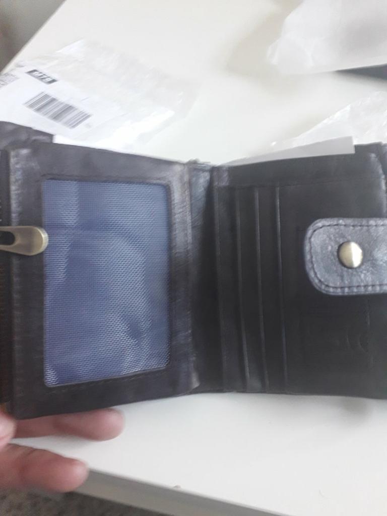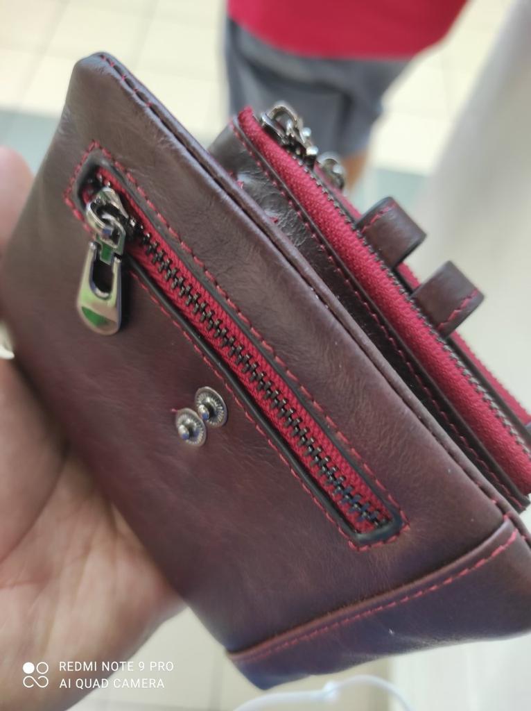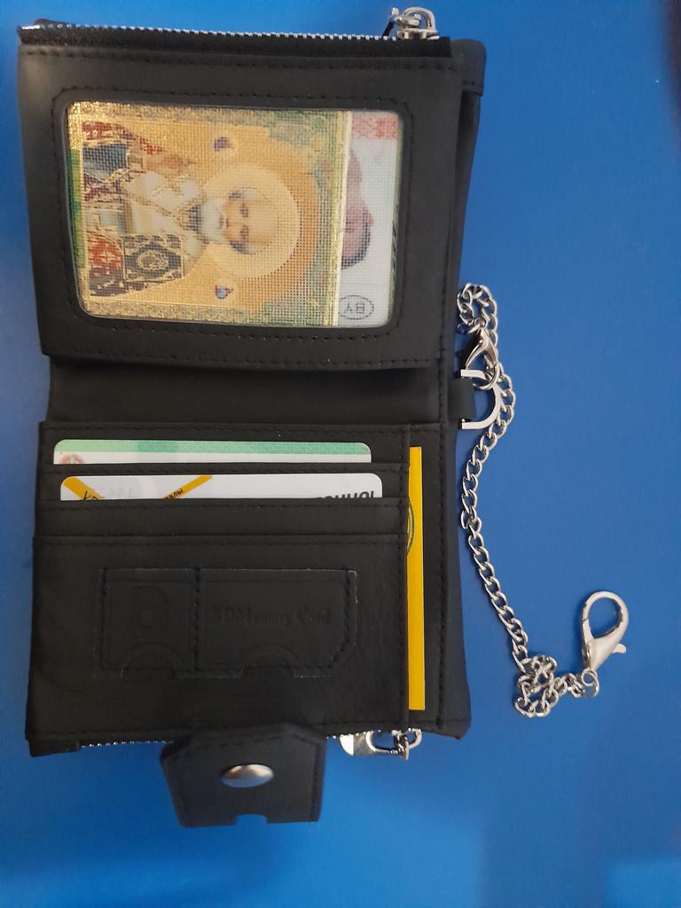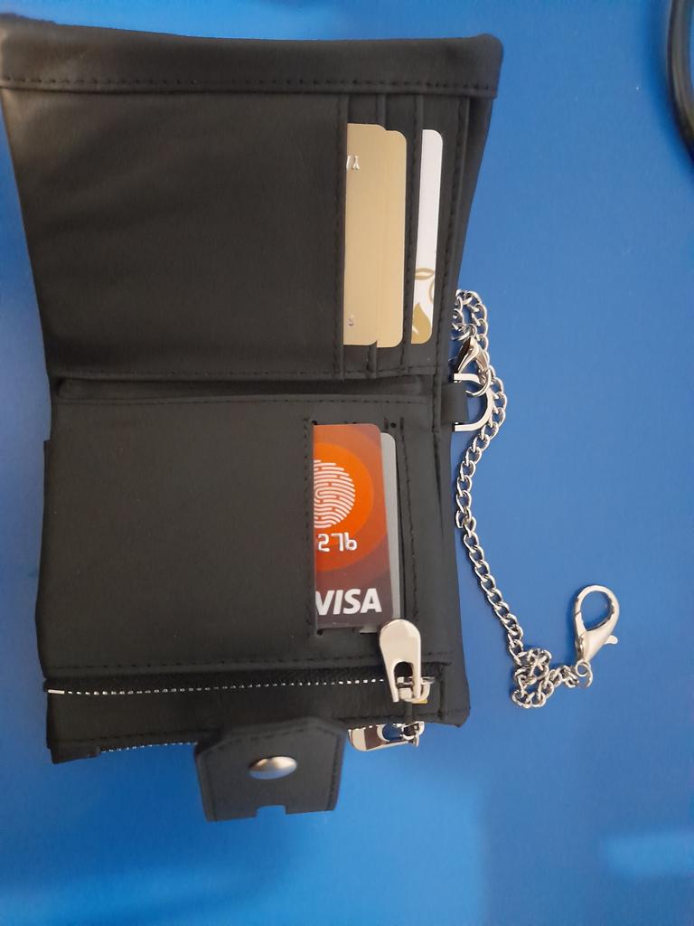 Pilns ar slotiem kredītkartēm, skaista āda, ķēdes stiprinājums, kas novērš zādzību, daudz vietas.