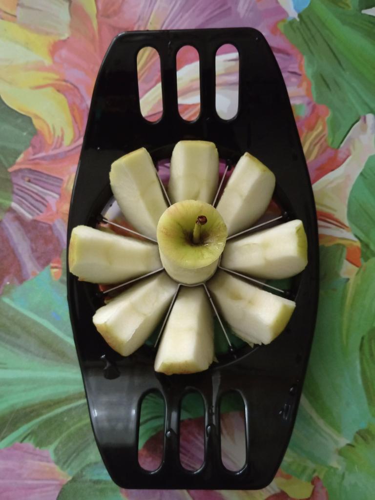 Laba ābolu griezējs. Naži ar robiņiem, bet asi. Ābolu sagrieza viegli, bet miziņu līdz galam nepārgrieza.