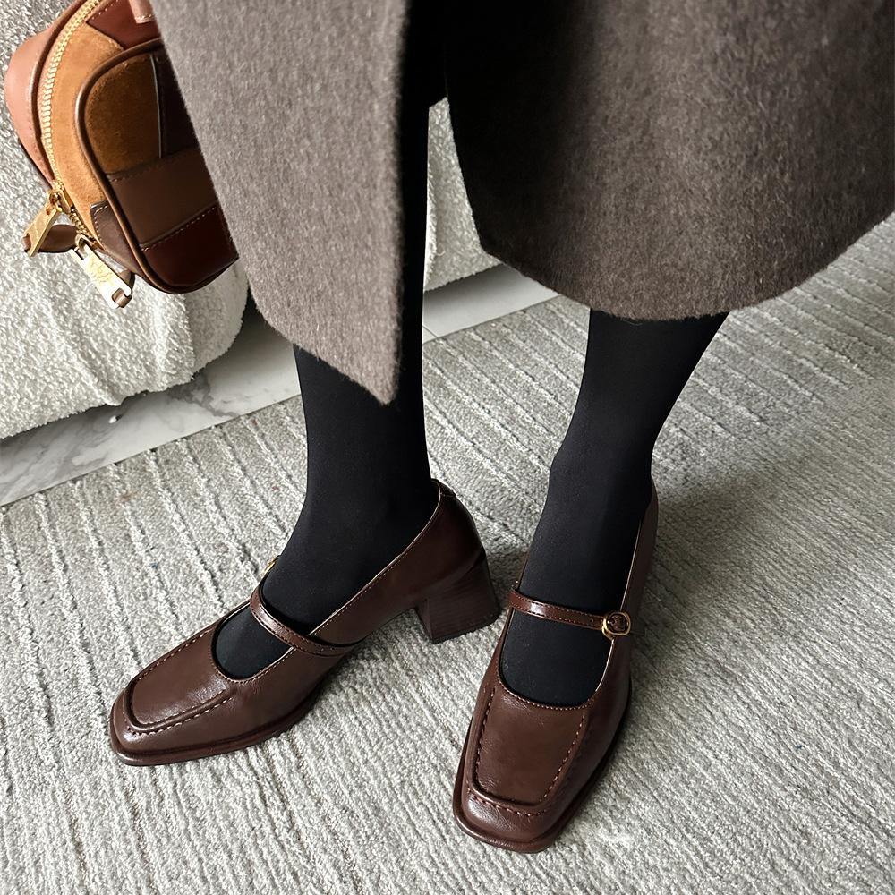 Aitādas versija~ retro ādas viena vārda sprādze bieza papēža augsti papēži sieviešu pavasara kvadrātveida galva Mary Jane kurpes platformas vienkurpes dāmu kurpes