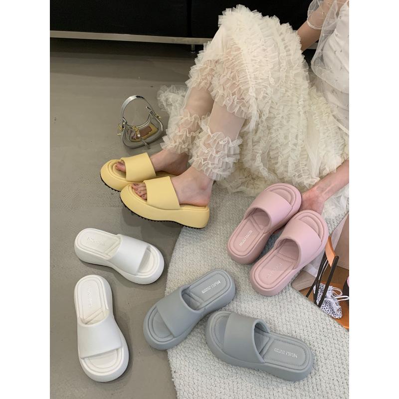 In the summer of 2025, the new thick-soled one-word cool slippers wear candy color with skirts to increase the height of beach shoes for women