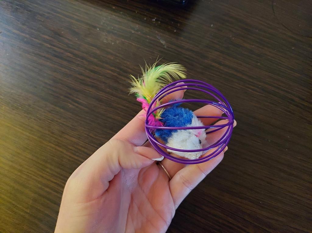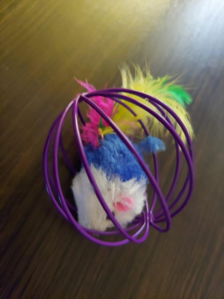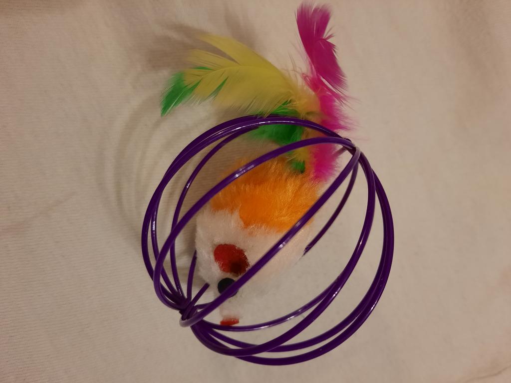 Så glad jeg er for at jeg bestilte denne leken - min Javik elsker den veldig mye. Inni er et mykt leketøy - en mus; På toppen en metallring laget av tynt metall; Musen lager en raslelyd når den beveger seg. Noen ganger, under spillet, tar katten ut lekeballen ved halen. En hale laget av fjær - han er interessert. Men musen er lett å sette tilbake. Elsker det - bruker det ofte, går på 2 bein. Spillerne er allerede 2 måneder gamle - så langt hele; men regelmessig i spillet.