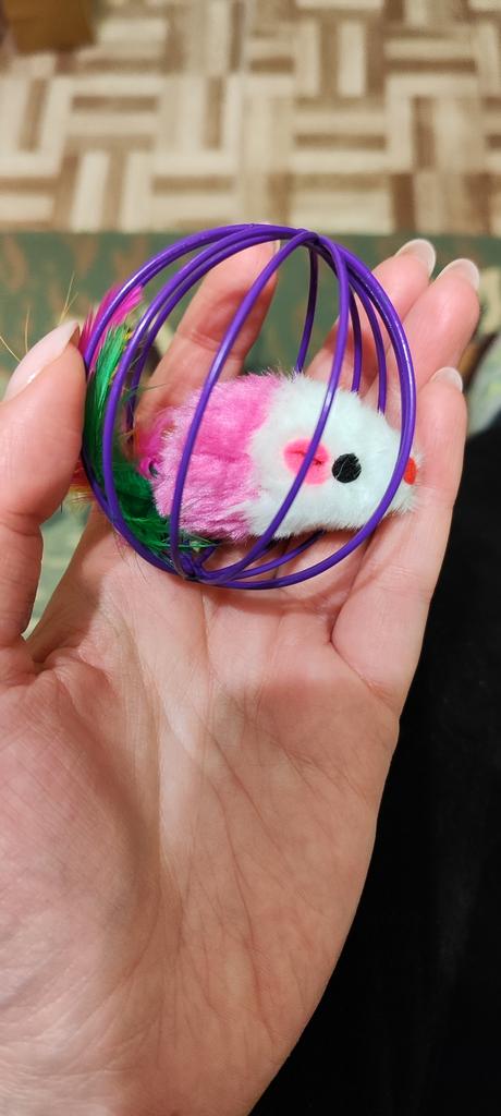 Leken er ikke liten, men musen flyr ut av ballen og selve ballen er tung og laget av metall, jeg trodde det ville være lettere, katter vil ikke leke🙂🙂🙂