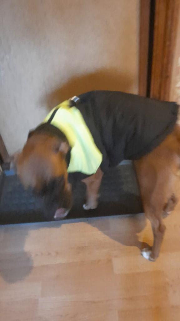 Den er perfekt for en hund på 25 kg. Jeg legger igjen mål: Hals 53cm, bryst 70cm og rygg 52cm