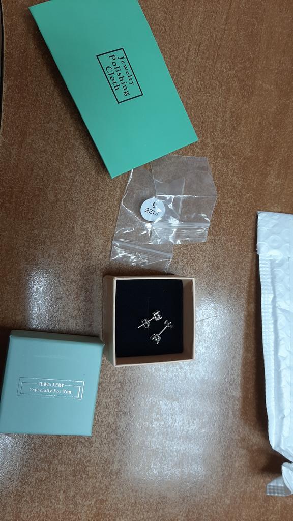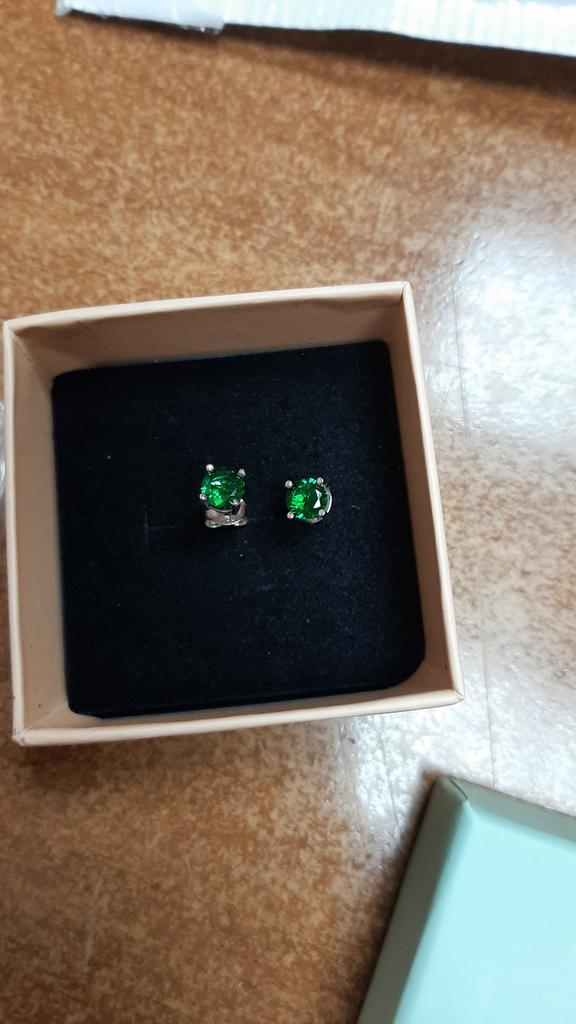 Bestillingen ble levert på 19 dager som rekommandert post og var godt pakket i en boblekonvolutt. I tillegg ble varene pakket i egen boks. Dette er flotte øredobber i ekte sølv fra merket "Umcho" med smaragdgrønne steiner, som jeg bestilte i størrelse 5mm. Øredobbene var tilgjengelig med steiner mellom 5mm og 8mm i størrelse og i fargene lyseblå og mørkegrønn. Øredobbene er laget av 925 sterling sølv og er av meget høy kvalitet. Steinene er veldig mørke, men skinner veldig intenst i sollys og er svært mangefasetterte og slipt med skarpe kanter. Pluggene passer utmerket til øredobbene, som jeg allerede har anmeldt før. Jeg er veldig fornøyd med produktet og selgeren og anbefaler gjerne begge.