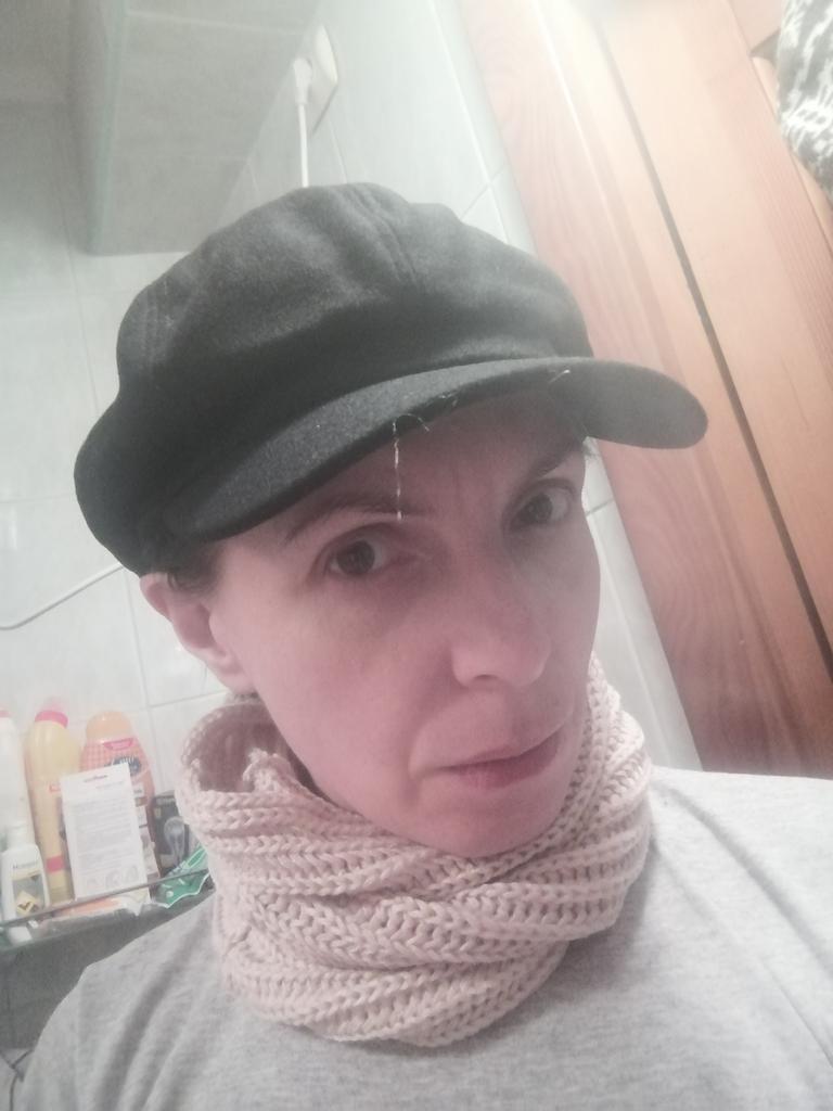 Den har en veldig stiv kant og strammer hodet litt... synd at modellen er veldig vakker.
