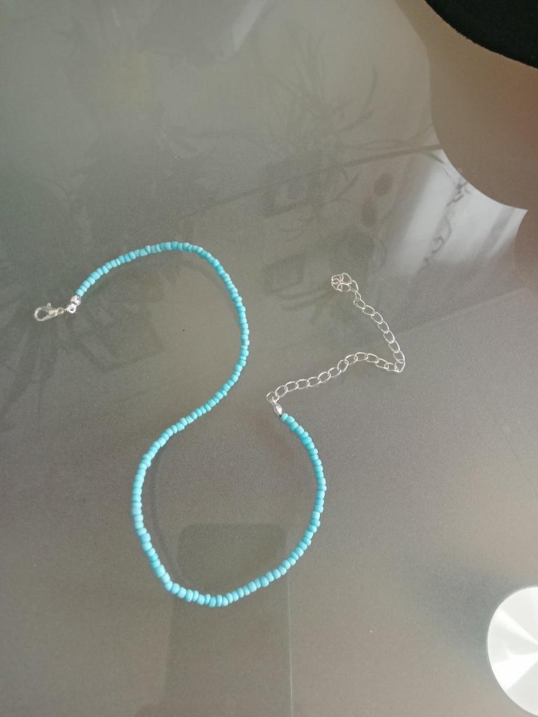 Choker laget av perler, valgt i blå farge. Lengden er justerbar, selve perlene er av forskjellige størrelser.