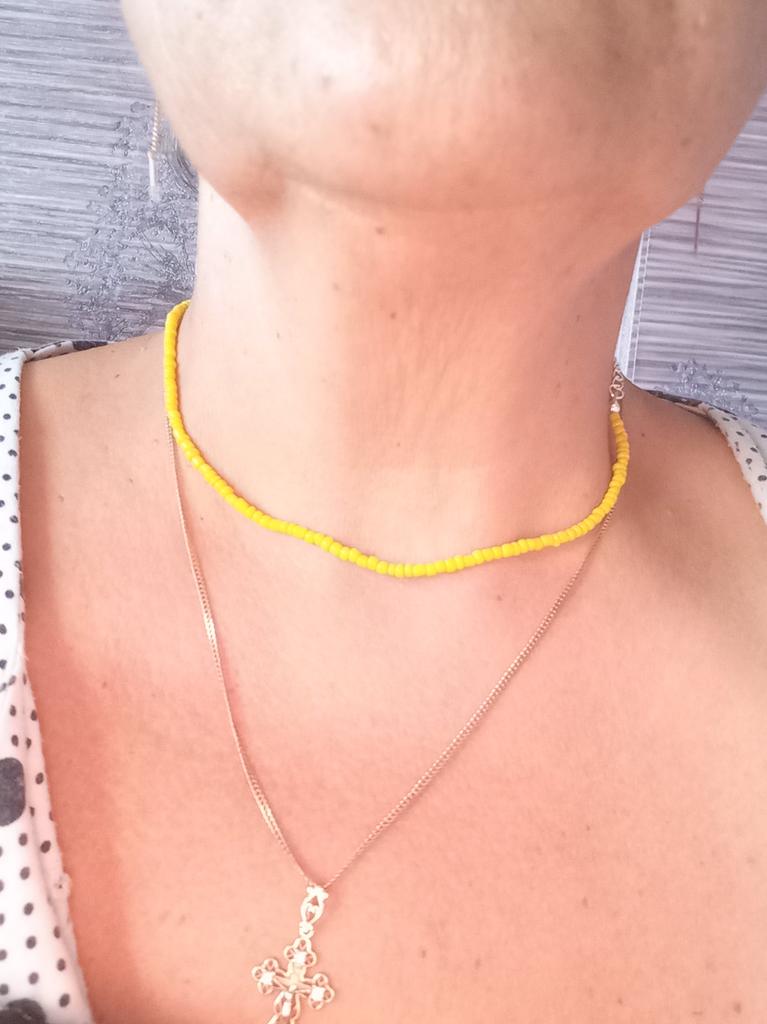 Et gult halskjede med perler! En vakker og elegant ting jeg bruker den med andre fargerike halskjeder, den ser stilig ut jeg bruker den som en choker, men man kan også bruke den som et armbånd Raskt levert sammen med mine andre pakker Takk! 💛🌟