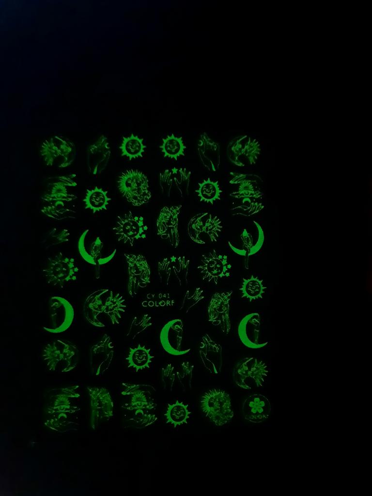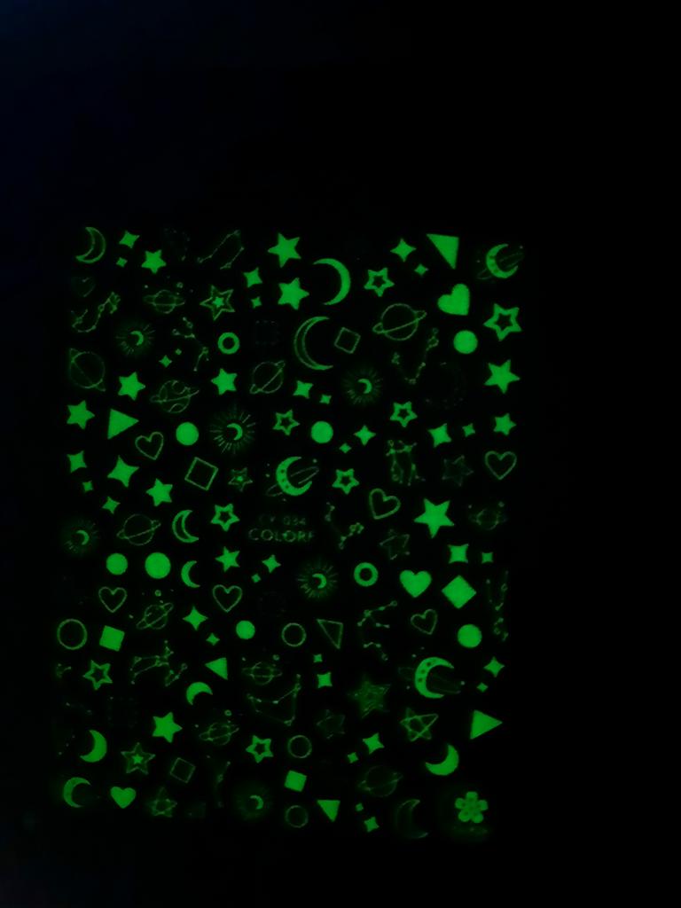✔De små frimerkene er veldig søte og tynne. ✔ Holder seg enkelt til negler. ✔I lyset ser de hvite ut og i mørket skinner de 🤩 ✔De lader med hvilken som helst lyskilde, selv med lommelykten på mobiltelefonen din Absolutt anbefalt! 💕