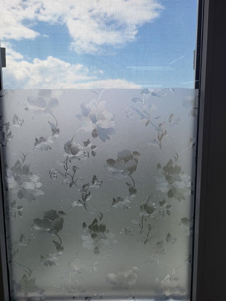 Produktet kom litt forsinket (noe som kan skje, og vi ble advart om denne spesifikke forsinkelsen - muligens lite lager på vår samlede store ordre); men i god stand! Noe med utførelsen av denne artikkelen gikk ikke så bra, mistenker jeg. De andre artiklene slører, i varierende grad, sikten inn i vinduet: slører sikten både på de frostede områdene og slører også på de iriserende områdene. Mens noen gjør det allerede fra svært kort avstand, gjorde noen andre det fra en meter unna - begge ga den annonserte effekten. Det er imidlertid dessverre ikke tilfelle med dette produktet!!!! I eksemplet kan man se hvordan synligheten fortsatt er der, flere meter unna filmen - og hvor krystallklar den er på den iriserende delen! Noe som ikke var tilfelle med den iriserende delen på de andre versjonene av dette produktet!! Det lette flekkvise iriserende belegget er mye mer flekkvis og ujevnt på denne, og er flekkete på noen områder - noe som blir veldig synlig på grunn av hvor klar filmen er! Siden andre kunder ikke ser ut til å ha hatt et slikt problem med sin versjon av denne spesifikke modellen av produktet, frykter jeg at det kan ha vært en dårlig produksjonsserie; dårlig nok til at den dessverre ikke kunne brukes til det tiltenkte formålet