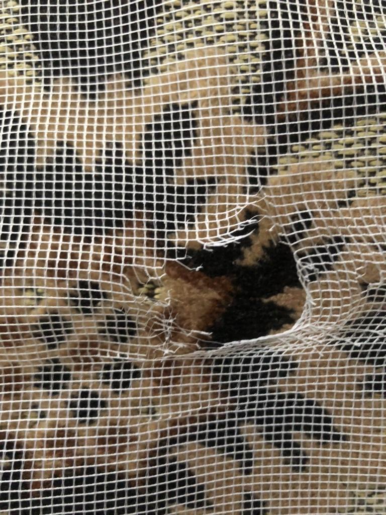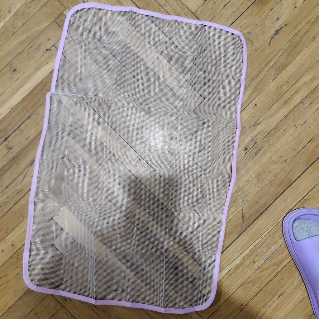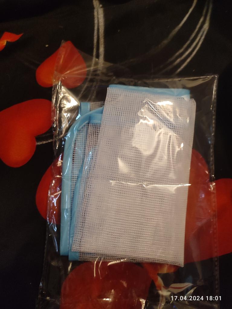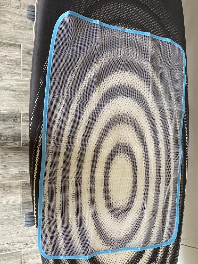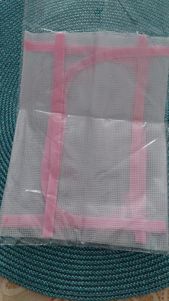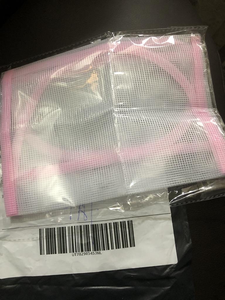 Lerretet er ganske stort, laget av syntetisk mesh, jeg har ikke prøvd å stryke det enda, håper det ikke smelter ved høy temperatur.