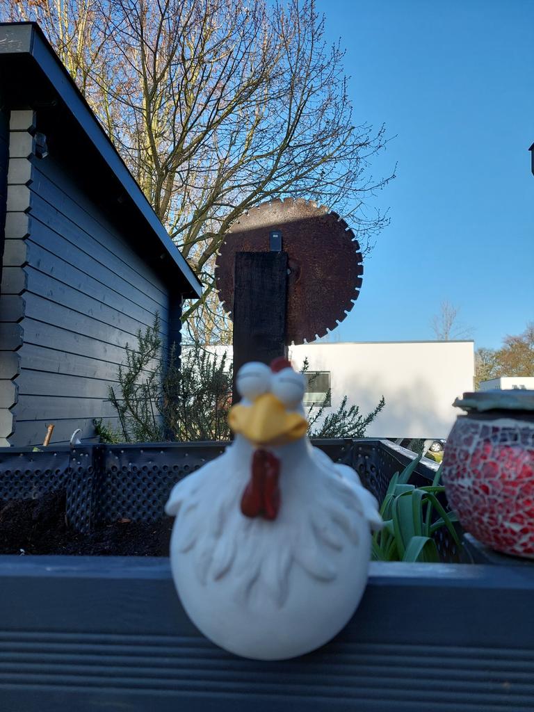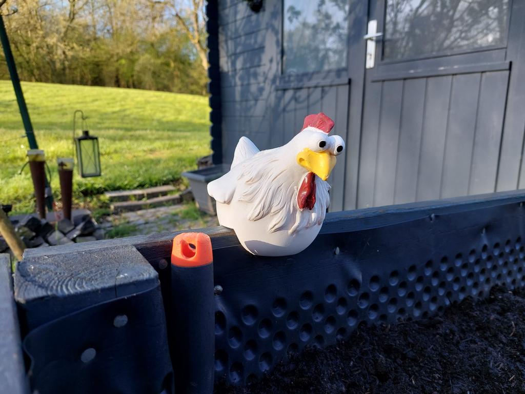 Morsom kylling, men passer ikke på balkongrekkverket mitt. Synd.
