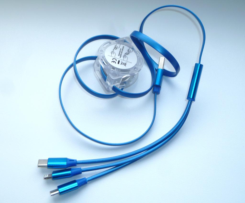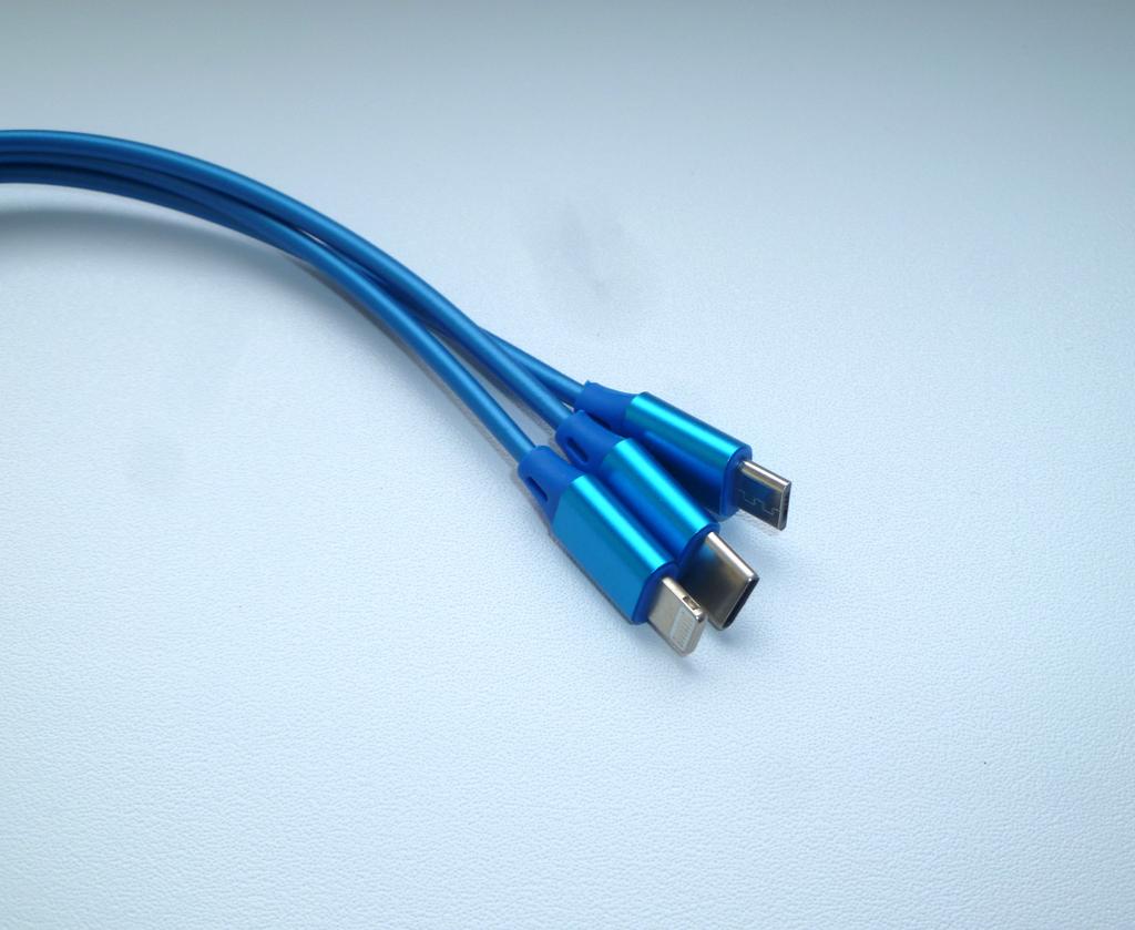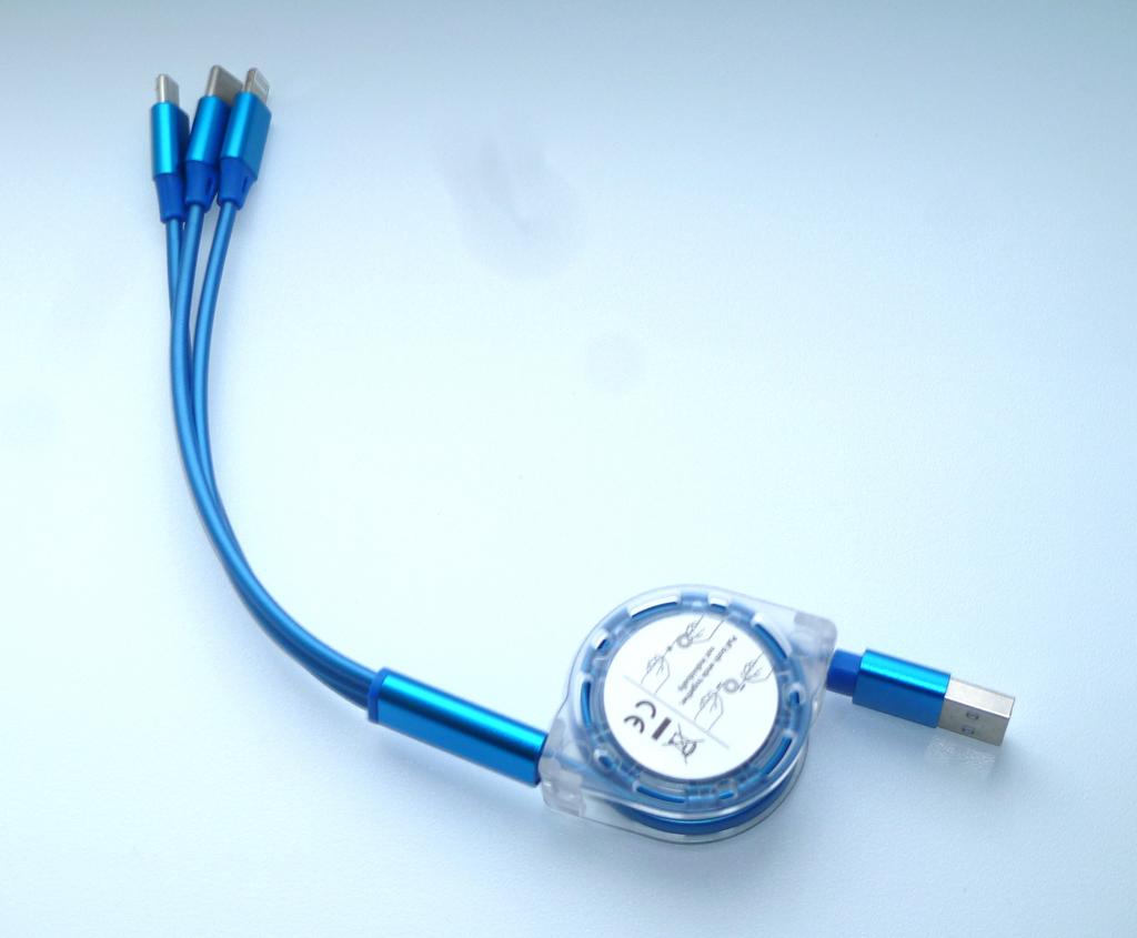 Universal 3 i 1 uttrekkbar kabel. Den raske dataladekabelen lar deg koble Android-, Apple- og microUSB-enheter til en bærbar PC eller annen enhet med USB Type A-port. Kabelen kan brukes til å overføre og synkronisere filer, samt lade flere mobile enheter. Universal hurtigladekabel lar deg enkelt lade smarttelefonen. Det utvidede plasthuset til koblingene reduserer risikoen for kabelskader ved koblingspunktene, og nylonflettingen med fleksibelt aluminiumskabelrør er svært slitesterk og robust i drift.. Denne ladekabelen kan brukes med alle enheter som har en Micro-USB, Type-C eller Lightning-kontakt. Takket være utformingen av ladekabelen kan du justere lengden. Maksimal kabellengde er 1,1 meter, noe som gjør det praktisk å bruke kabelen til lading på kontoret, hjemme eller i bilen, og på langtur kan du enkelt lade enheten fra Power Bank. Det vil gi høy kvalitet og stabil lading og dataoverføring for enhetene dine. Ladingen styres av en intelligent brikke, som bidrar til å beskytte smarttelefonbatteriet.