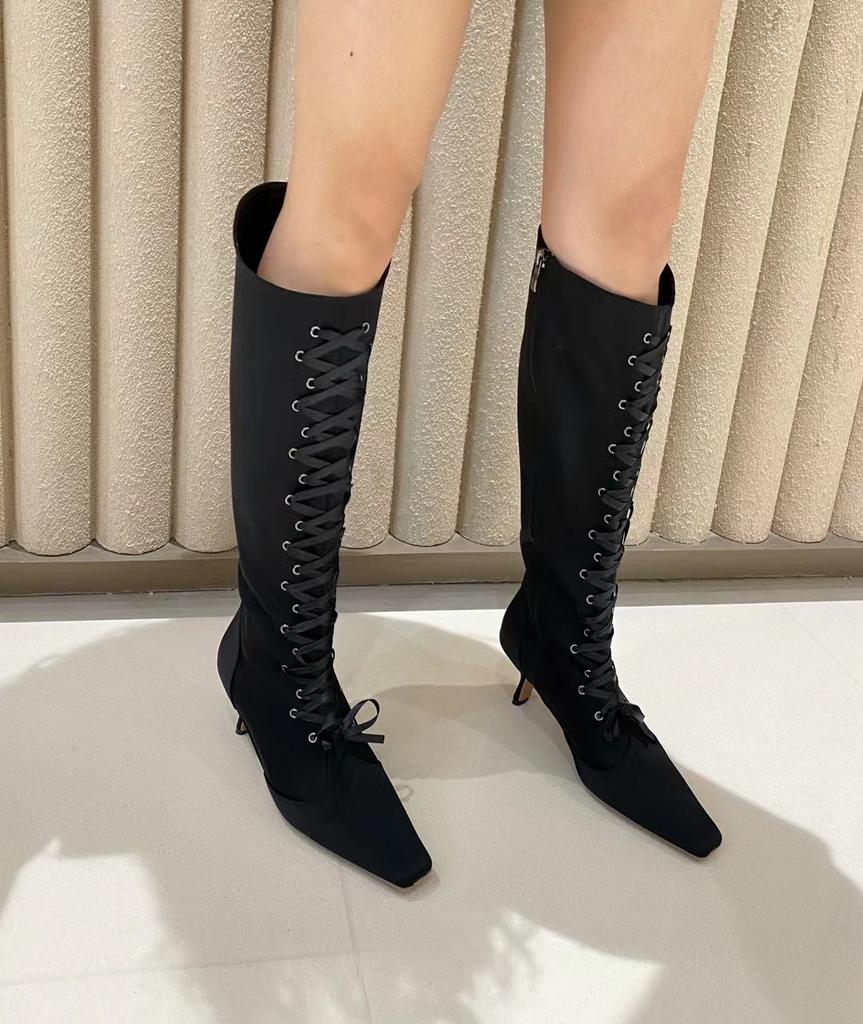 Mote Smal Firkantet Tå Dame Knehøye Støvletter Kryssreim Snøring Glidelås i Siden Svarte Brune Tynne Høye Hæler 2024 Nyheter Mote