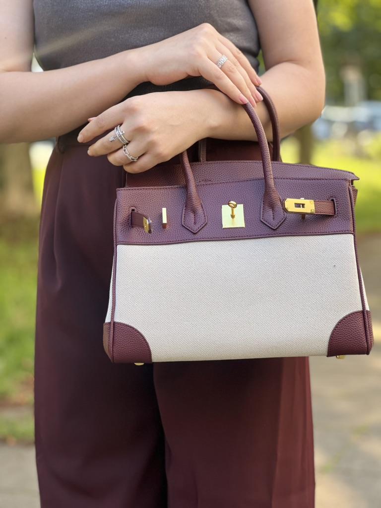 Vår 2025 dameveske i skinn og lerret i kontrastfarge med skulderrem