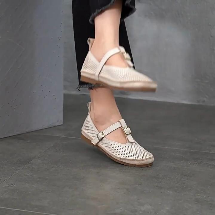 Johnature Retro Genuine Leather Soft Soled Hollow-out Sandals Round Toe Belt Buckle Flat Women's Shoes