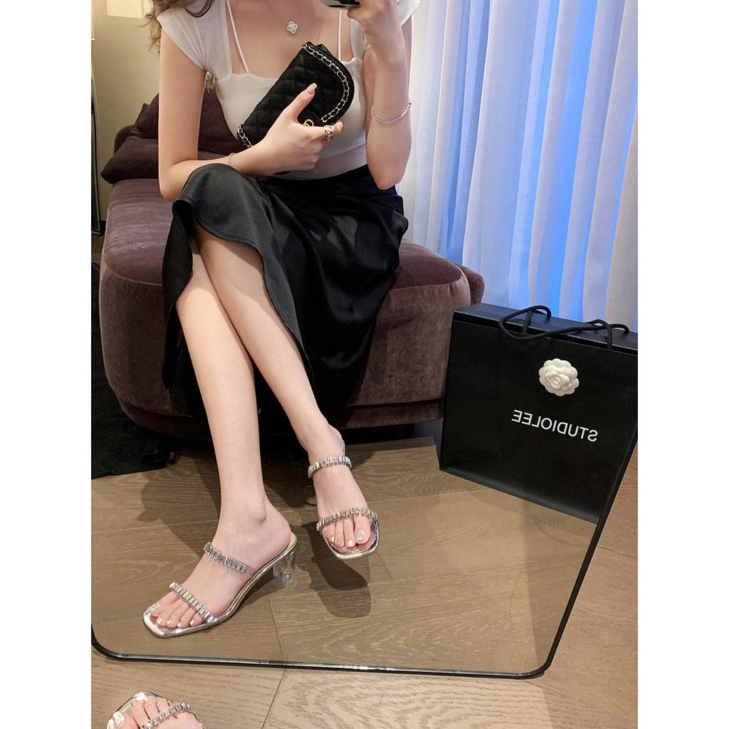 YD-20 [] Summer delicate fairy square head double one-word diamond with transparent thick heel sandals female