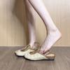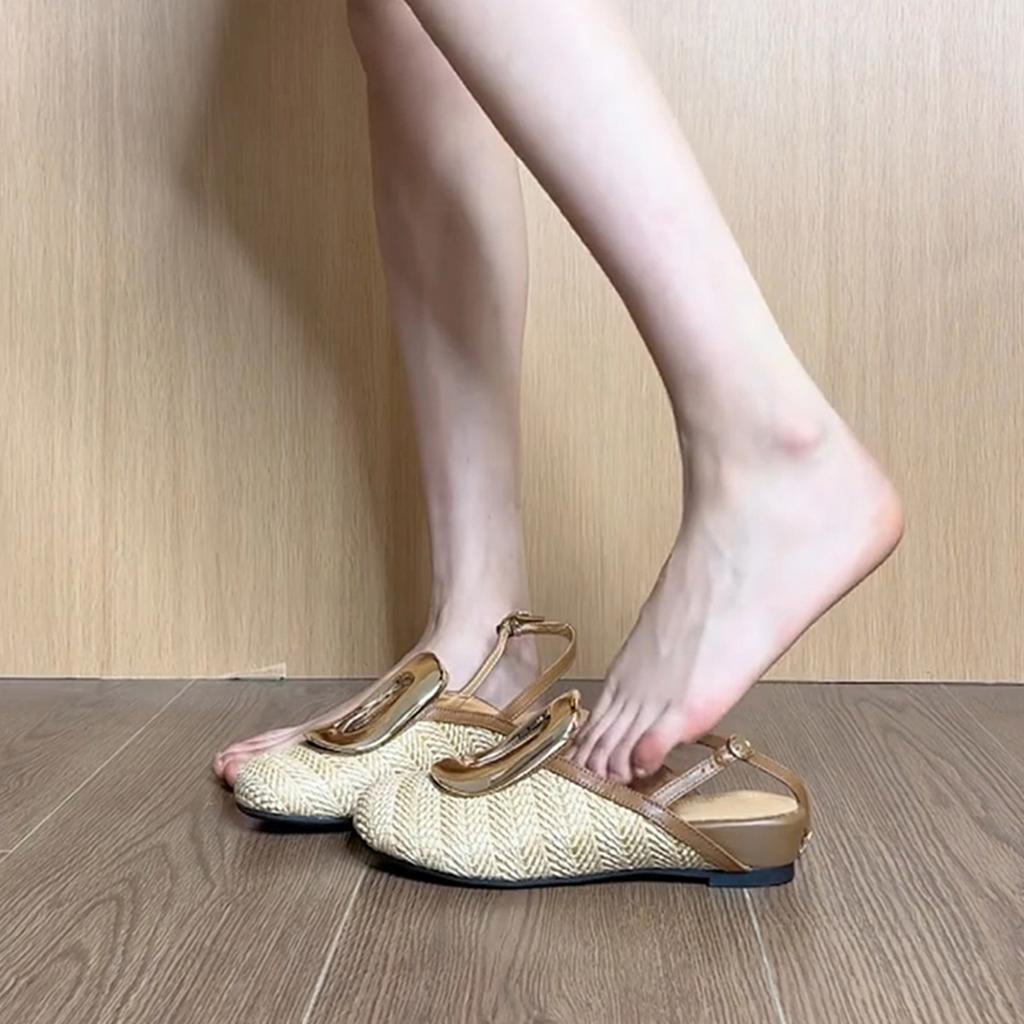 Niche personality design sense straw woven holiday wind bag head shoes women's rear strap hollow wedge half slippers