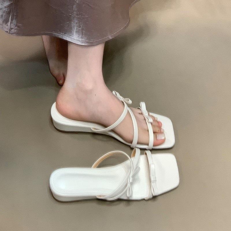 Bow square head low heel one-word drag wearing sandals versatile pink sandals