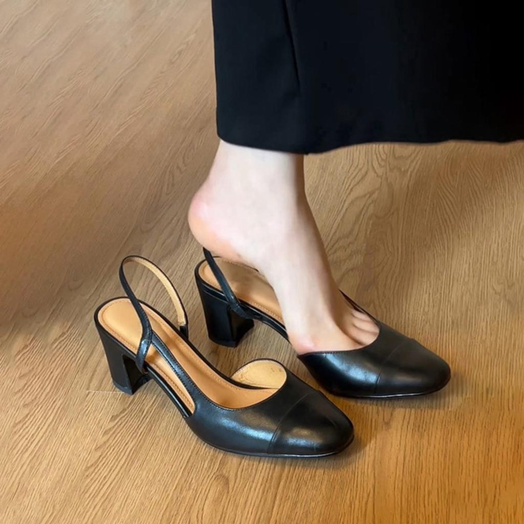 New retro round head rear strap sandals femininity medium heel simple round head literary style high heels