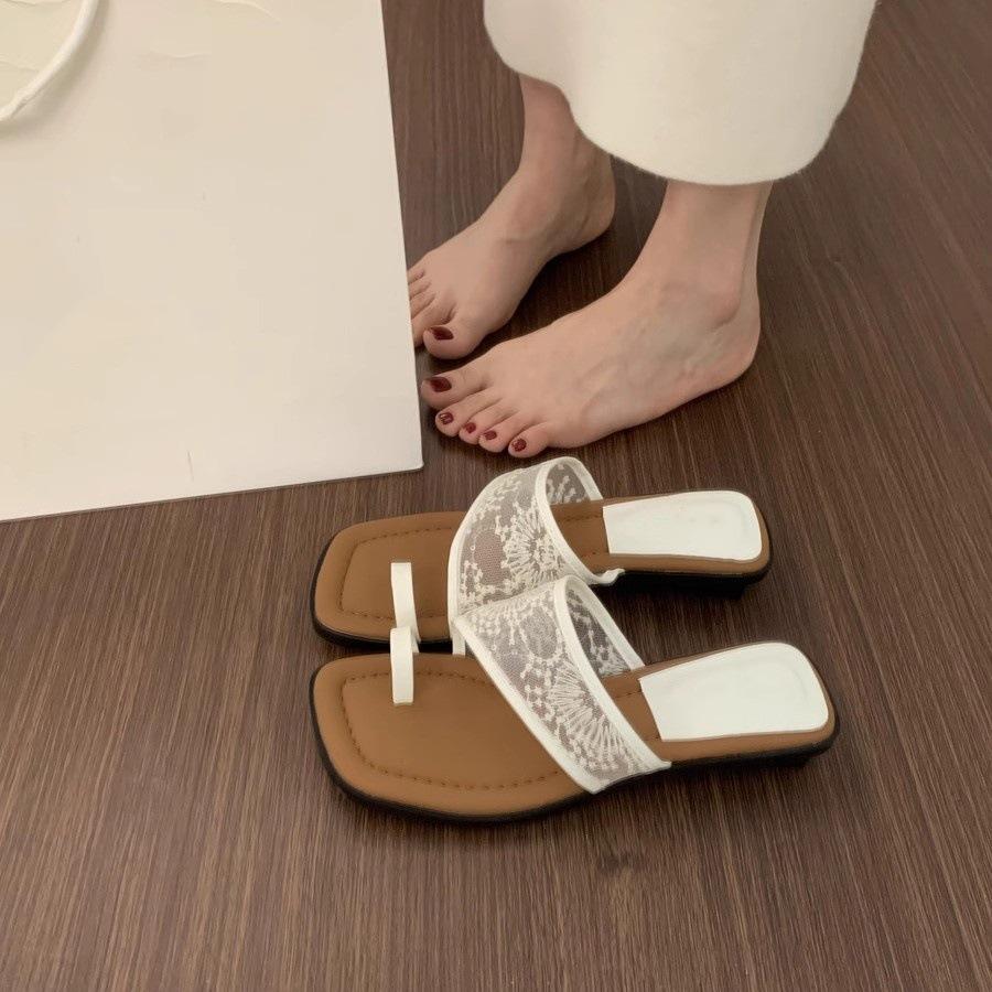 Lace cover toe slippers women are not tired feet small slope heel with skirt beautiful sandals