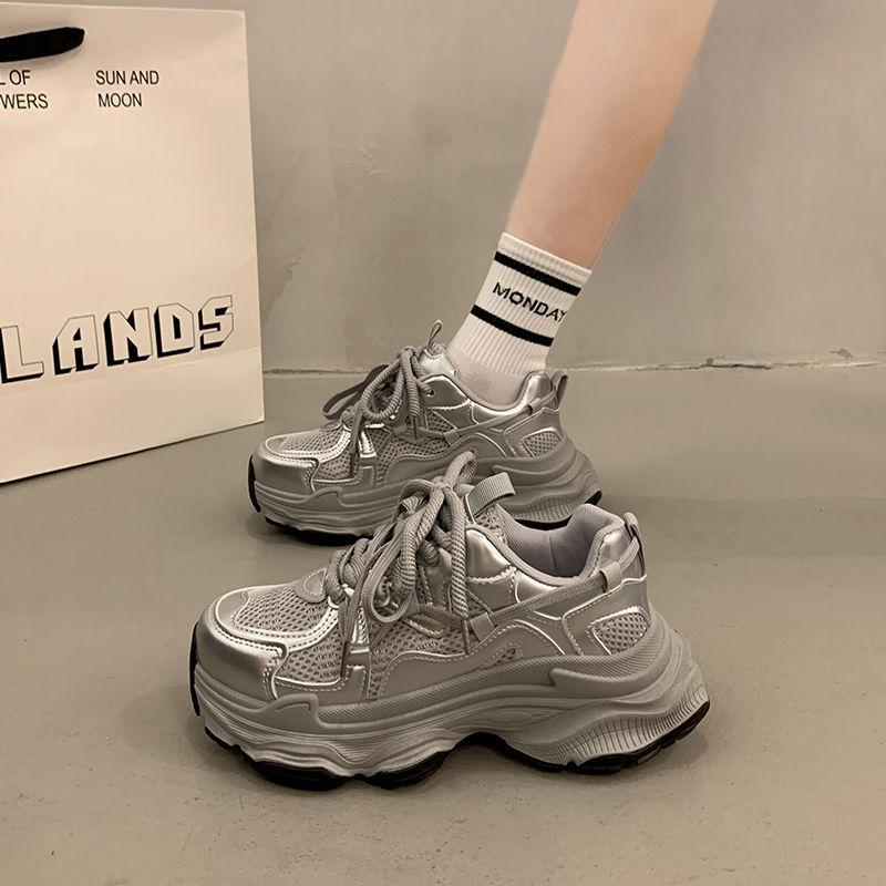 Silver platform women's shoes spring and autumn heightening mesh breathable casual sports shoes