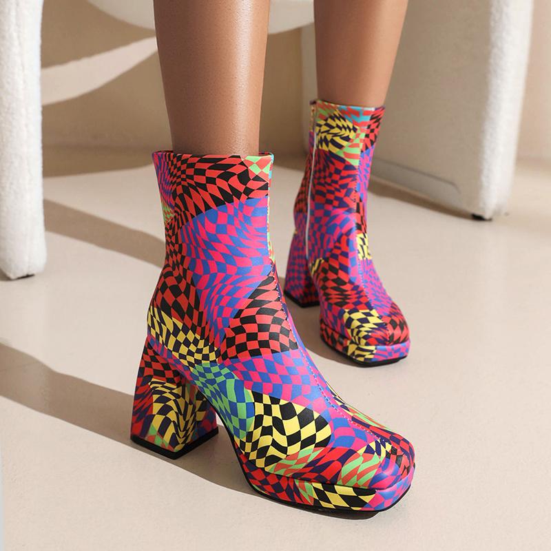 Rutemønster Firkantet Tå Kraftig Hæl Høye Damesko Rutemønster Catwalk Sko Glidelås Plysj Innside Vinter Korte Støvletter