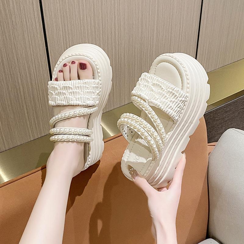 Fairy wind thick-soled muffin two wear sandals, female outer wear popular summer new slope heel beaded muffin bottom cool slippers