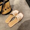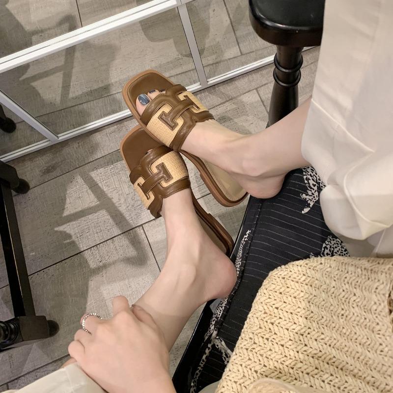 Sheepskin holiday style square head straw slippers women's summer outer wear splicing versatile contrasting color cool slippers