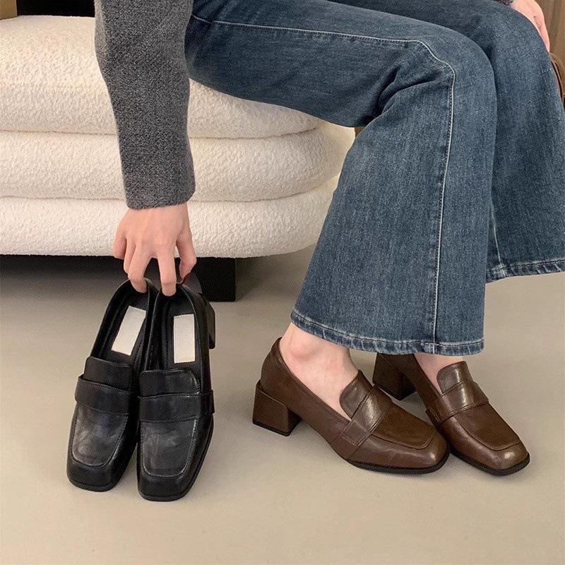 Black loafers square-headed lazy one-pedal thick high-heeled small leather shoes versatile French Mary Jane single shoes women's middle heel