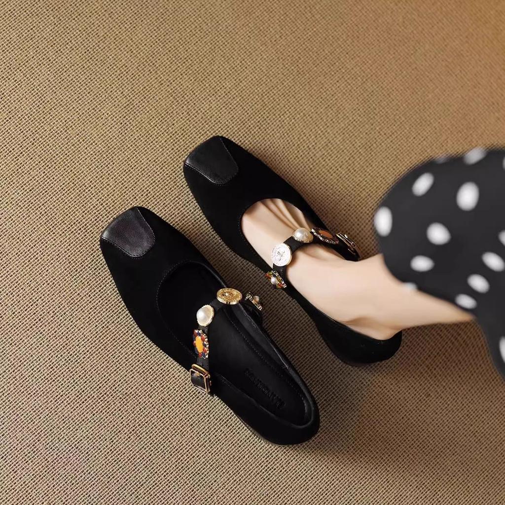 Autumn casual ethnic retro style square head thick heel rhinestone beaded one-word buckle belt women's shallow mouth single shoes