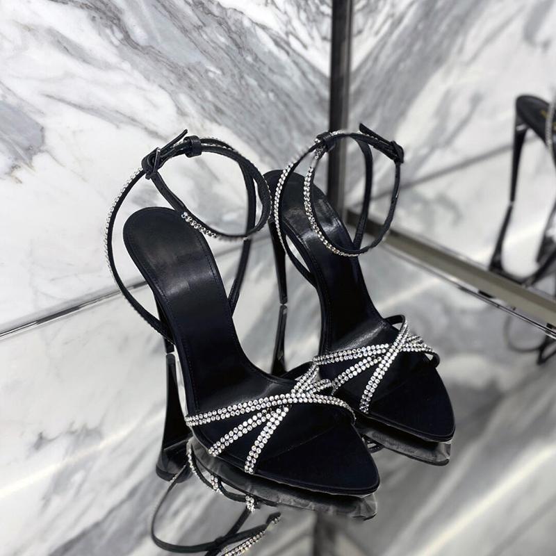 Fashion All-Matching New Pointy Open Toe Around Diamond Stiletto High Heels Female One-Line Buckle Black Satin Sexy Sandals Female