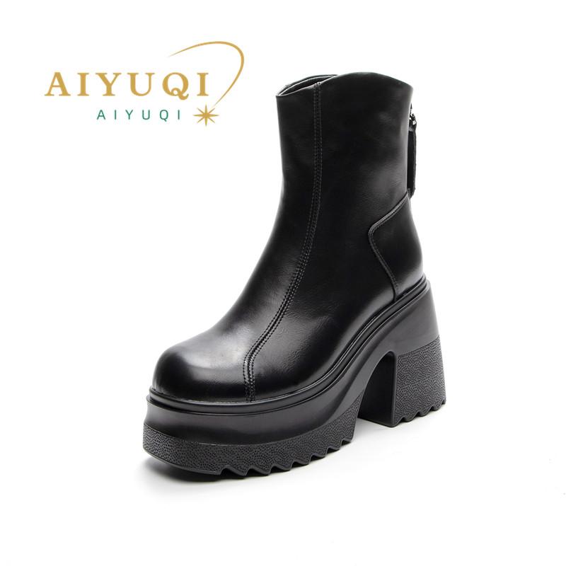 Mote AIYUQI Dame Høye Hæler Støvletter Ekte Skinn 2025 Ny 10cm Hæl Høye Dame Støvletter Plattform Britisk Stil Mote Støvletter Damer