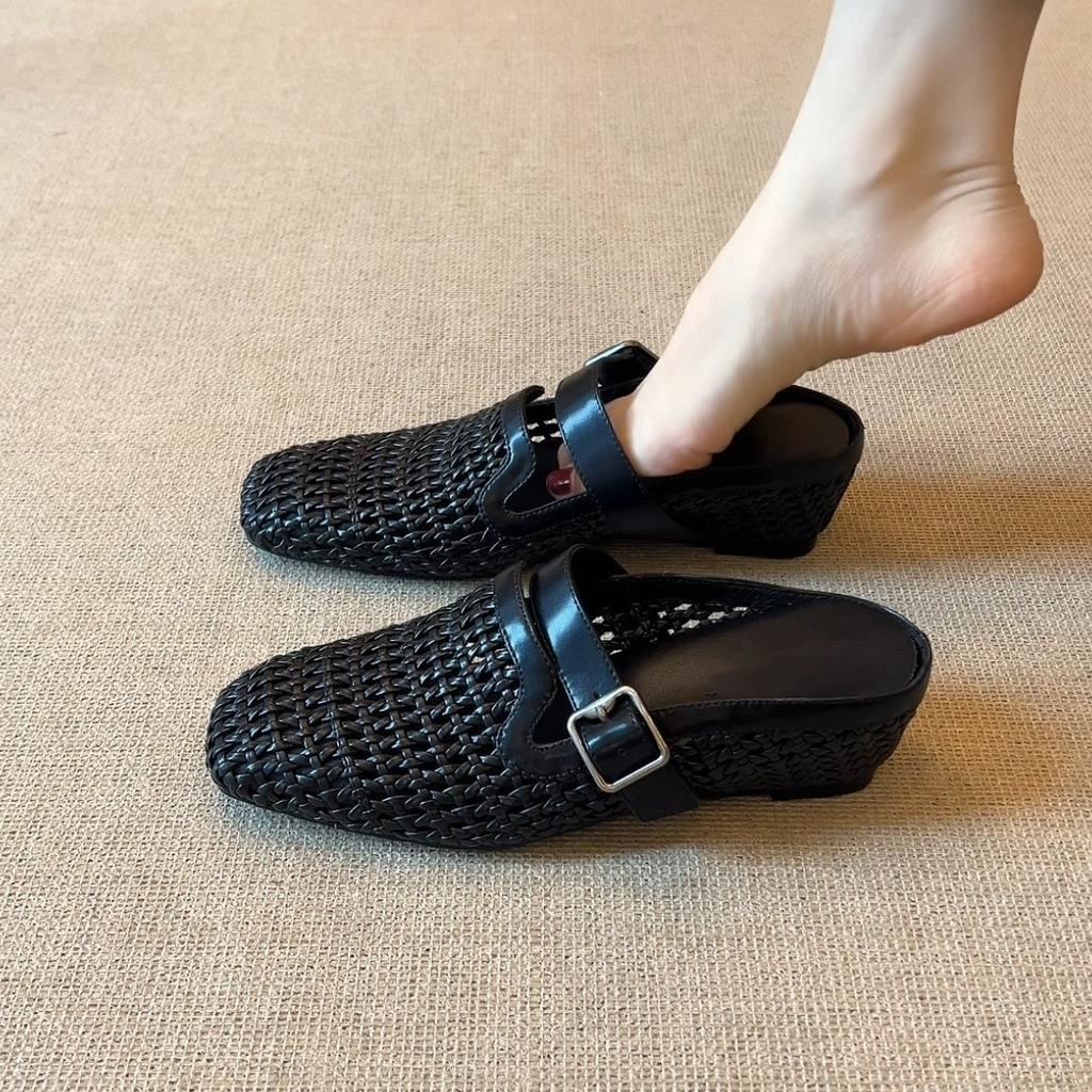 Holiday style woven wedge heel Muller shoes belt buckle breathable bag head outer slippers