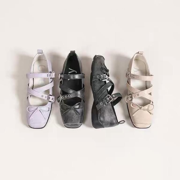 Casual sports bottom ballet shoes women's 2025 new shallow mouth square head pig nose retro bow flat shoes