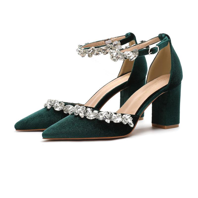 Heel High Heels Pointed Velvet Hollow Rhinestone One-word Buckle Wedding Shoes Bridal Shoes Bridesmaid Shoes Banquet Shoes Women
