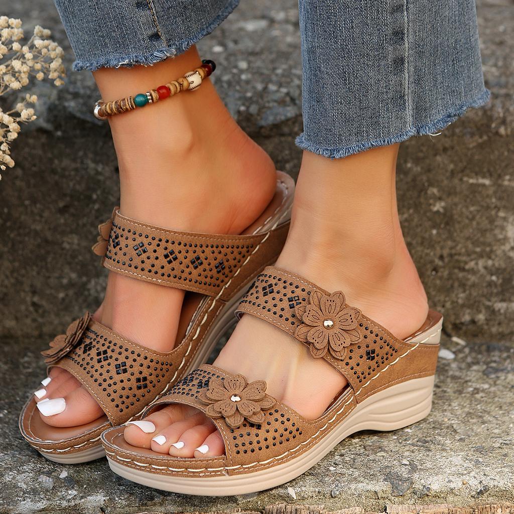 Fashion Shoes Women Low Slippers Summer Lady Flower On A Wedge Pantofle Slides Big Size Heeled Mules Soft Girl 2025 High Rome Retro PU